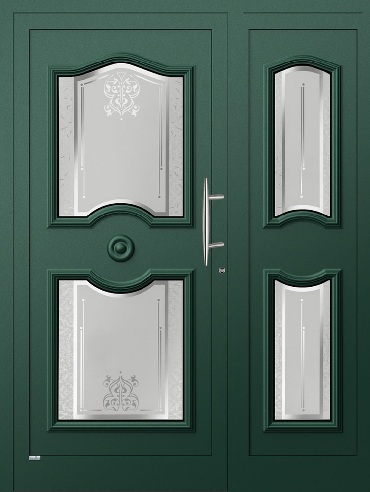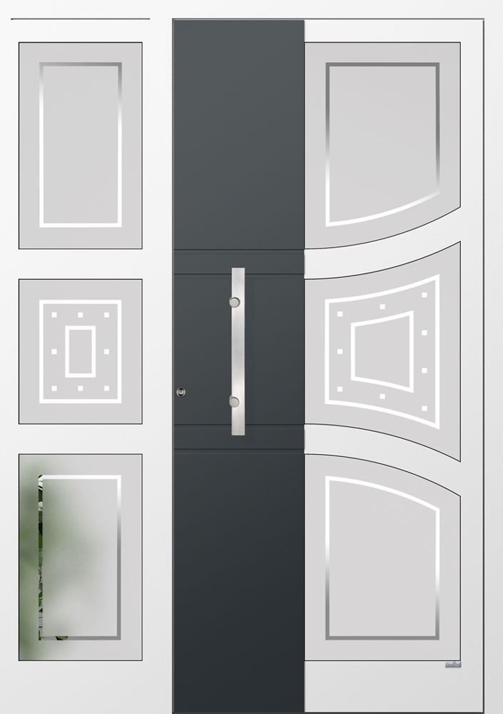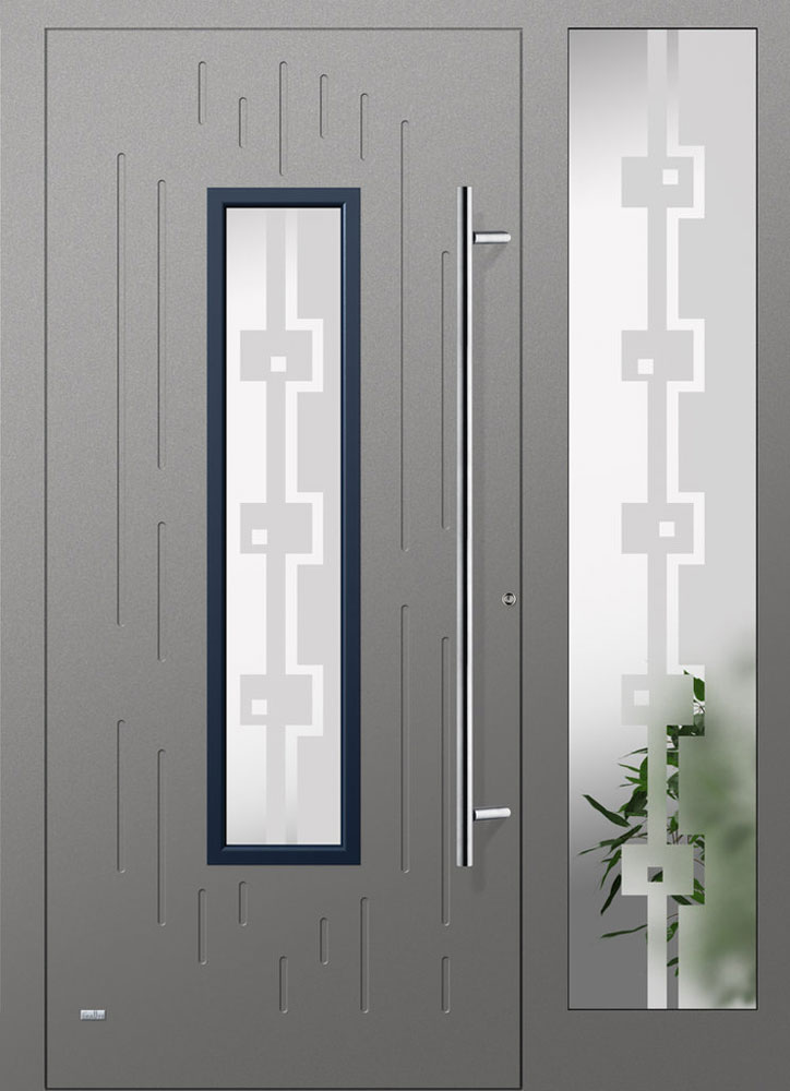 Applikationen in pflegeleichter Edelstahloptik sowie flächenbündig eingearbeitete Dekorelemente und Designverglasungen, deren Dekor sich in der Verglasung des Haustürseitenteils fortsetzt, sind einige der charakteristischen Merkmale dieser Serie.