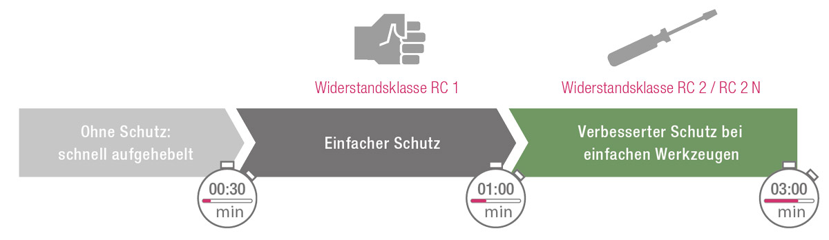 80% aller Einbrüche finden über leicht zugängliche Fenster und Türen statt. Bei mehr als einem Drittel bleibt es dank verstärkter Sicherheitstechnik beim bloßen Versuch. Schützen Sie Ihr Zuhause, indem Sie Fenster und Türen besser sichern. Einbrecher suchen sich schnell ein anderes Ziel, wenn sich ein Fenster nicht innerhalb weniger Sekunden aufhebeln lässt. Die Hebeschiebetür kann bis Widerstandsklasse RC2 gemäß EN 1627 aufgerüstet werden.